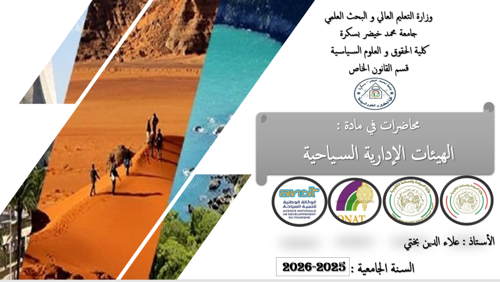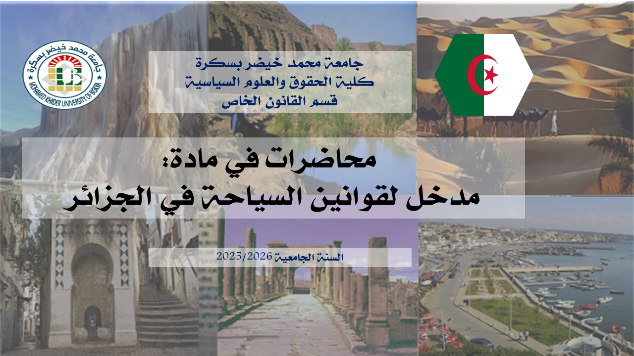 الهدف المتوخى من المادة: تزويد الطالب بمختلف المفاهيم القانونية والفقهية الخاصة بالسياحة والفندقة، مع ضبط التطور التاريخي لهذه المهن في الجزائر، وينتظر من الطلبة بعد نجاحهم في هذه المادة أن يكونوا قد تمكنوا من فهم مختلف مراحل تطور التشريعات السياحية في الجزائر، ومختلف الأنشطة المرتبطة بمجال السياحة والفندقة.