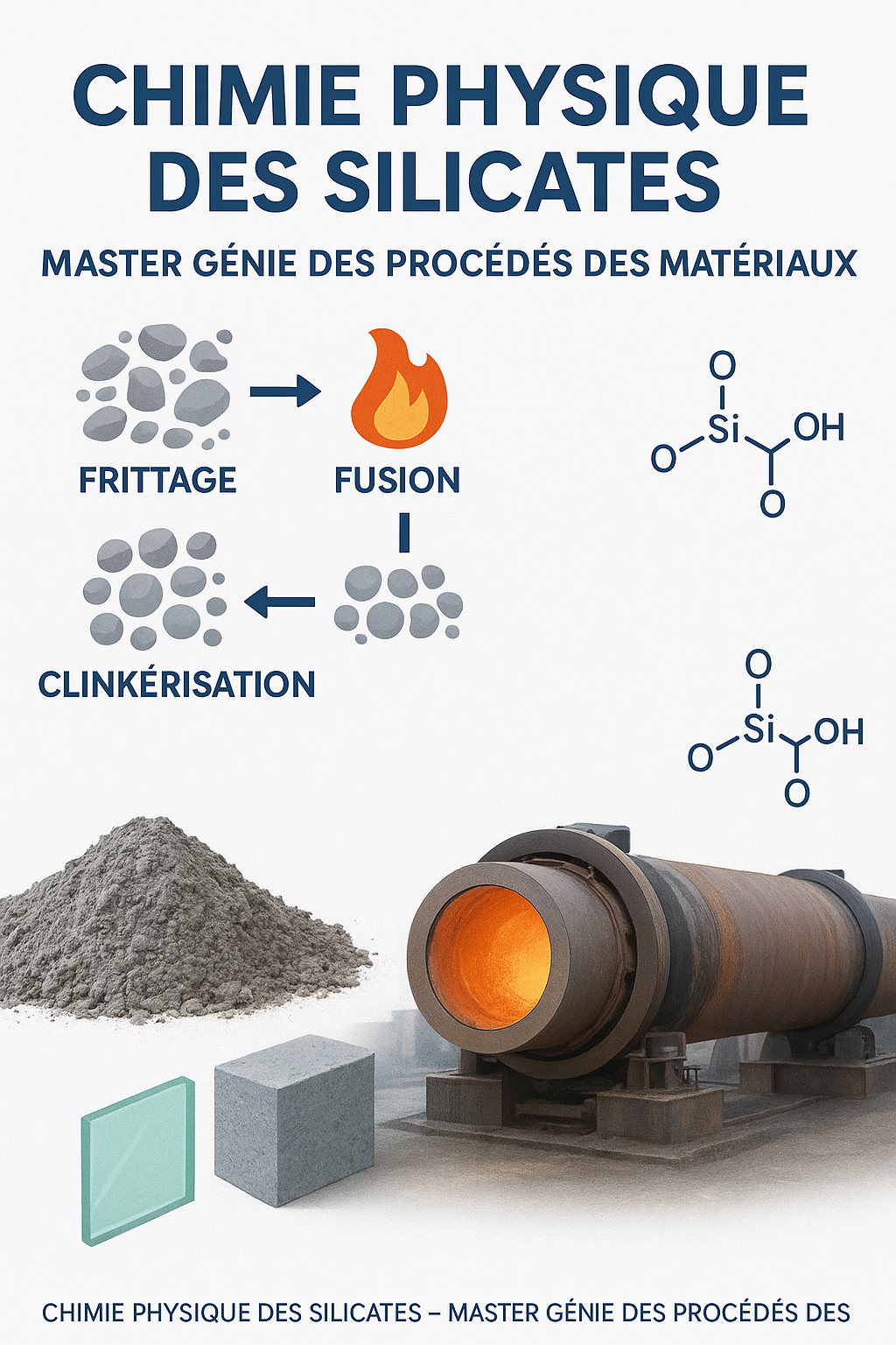 Le cours de Chimie Physique des Silicates, destiné aux étudiants de Master  1 en Génie des Procédés des Matériaux, a pour objectif de leur faire comprendre et assimiler les mécanismes physico-chimiques intervenant lors de la transformation de la matière sous l’effet de la température. Il aborde en profondeur les phénomènes d’interaction entre particules, les mécanismes de frittage, de fusion et de clinkérisation, ainsi que les processus d’hydratation des liants hydrauliques. Ce cours offre également une vision détaillée de la chimie, de la microstructure et des performances des matériaux de structure tels que les systèmes cimentaires, les céramiques et les matériaux vitreux. Enfin, une introduction à certaines questions de recherche actuelles dans le domaine des silicates et des matériaux connexes permettra aux étudiants de relier les connaissances fondamentales aux avancées technologiques et aux enjeux scientifiques contemporains.
