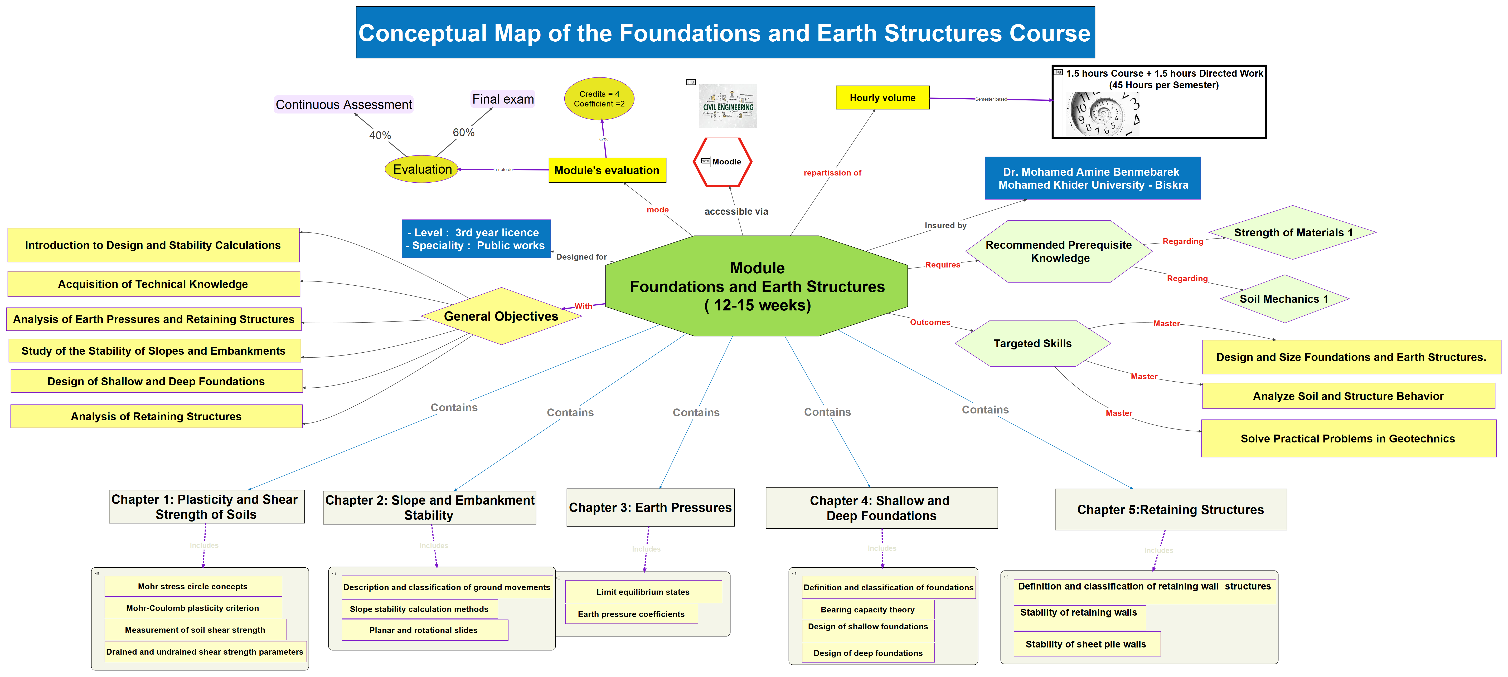The content of the course is organized around the following main areas:Chapter 1: Plasticity and Shear Strength of Soils: This chapter introduces Mohr's Circle for stress analysisand the Mohr-Coulomb failure criterion to predict soil behavior. Students will explore shear strengthmeasurement techniques, including direct shear and triaxial tests, and examine differences between drained and undrained conditions. Practical exercises focus on interpreting lab data for design applications.Chapter 2: Stability of Slopes and Embankments: This section analyzes landslide mechanisms, includingrotational slips and planar failures. Stability methods like Fellenius' and Bishop's approaches are applied tocompute safety factors, accounting for pore pressure and soil heterogeneity. Mitigation techniques, such asdrainage and soil nailing, are discussed through case studies.Chapter 3: Earth Pressures: Students learn to calculate lateral earth pressures on retaining structures usingRankine, Boussinesq, and Prandtl theories. The chapter covers at-rest, active, and passive states, emphasizingtheir role in designing walls, sheet piles, and excavations. Real-world examples demonstrate how pressuredistributions influence stability.Chapter 4: Shallow and Deep Foundations: Design principles for shallow foundations (bearing capacity,settlement) and deep foundations (piles, caissons) are covered. Students will use Terzaghi's theory and in-situtest data to size footings and estimate pile capacity, ensuring safe load transfer to the ground.Chapter 5: Retaining Structure: The final chapter focuses on designing gravity walls, cantilever walls, andsheet piles. Stability checks against sliding, overturning, and bearing failure are emphasized, with practicalexamples illustrating design steps and material selection