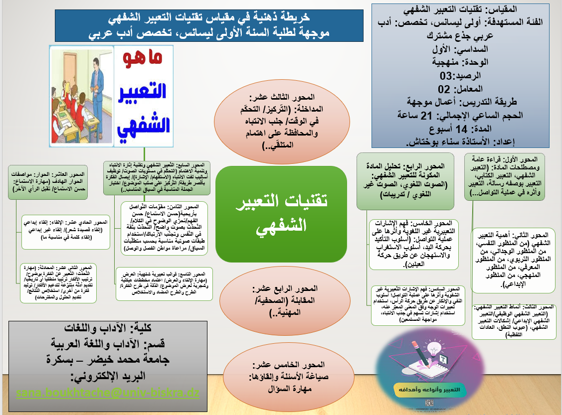 يُعد مقياس تقنيات التعبير الشفهي من المقاييس الأساسية في تكوين طلبة قسم الآداب واللغة العربية، ويُدرّس في السداسي الأول لطلبة السنة الأولى ليسانس جذع مشترك، ضمن الوحدات المنهجية الموجهة لتنمية الكفاءات اللغوية والتواصلية، يهدف هذا المقياس إلى تمكين الطالب من استعمال اللغة العربية في مواقف شفوية متنوعة، بطريقة صحيحة وواضحة وفعّالة، سواء في المجال الأكاديمي أو المهني أو الاجتماعي.