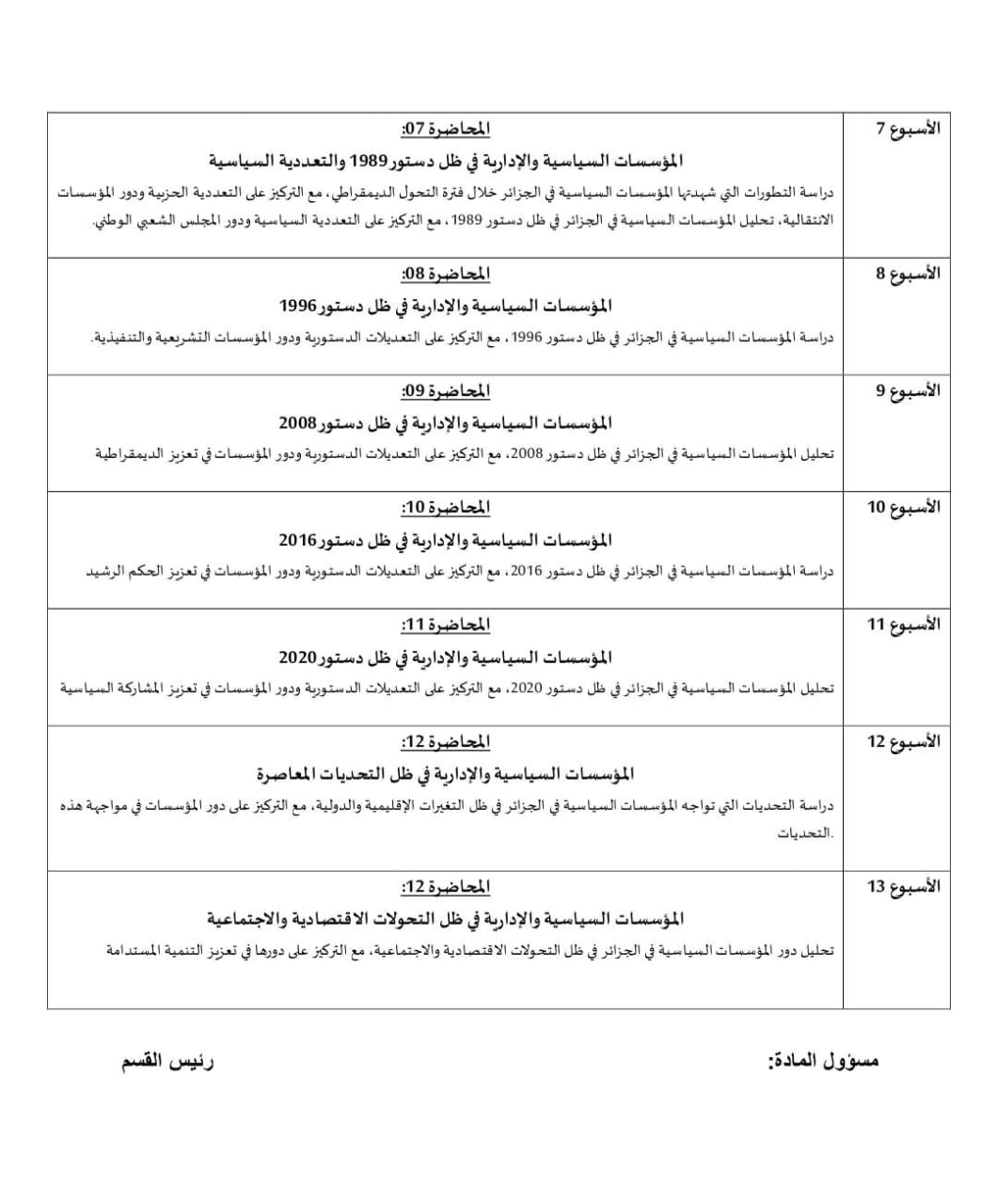 محاور مادة المؤسسات السياسية والادارية في الجزائر